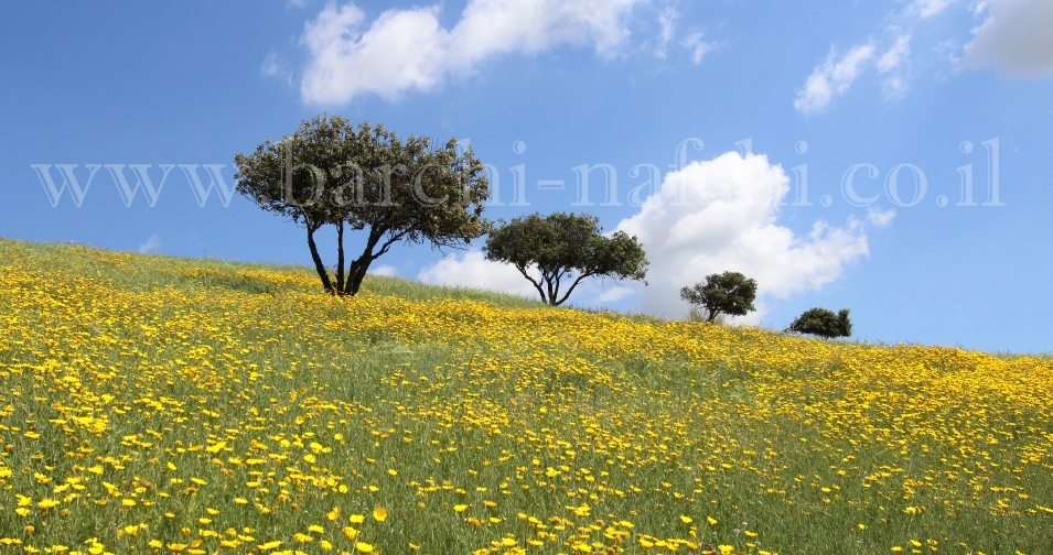 צילום אמנותי ומרגש, עצי חרוב בין פריחת חרציות צהובה. צולם בגליל התחתון.