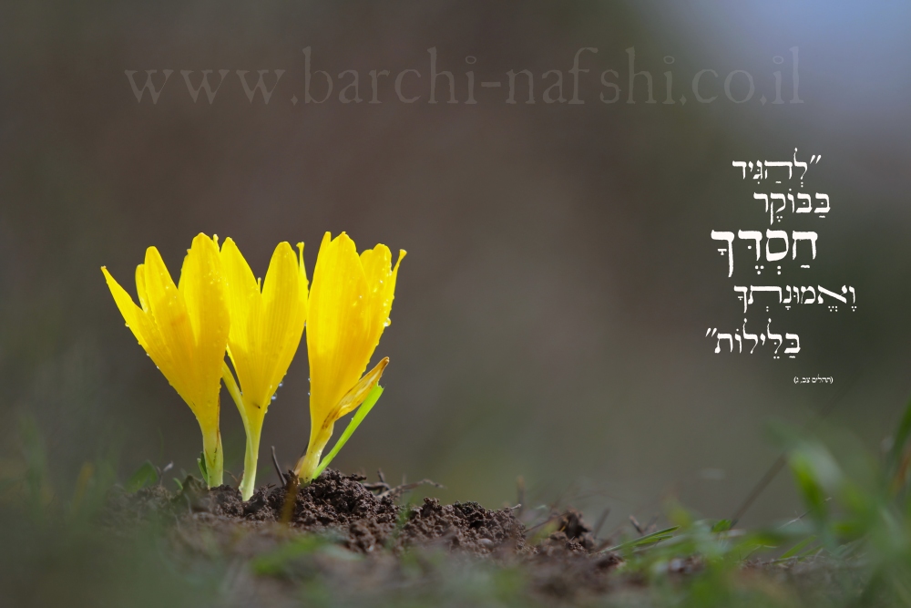 צילום בוקר אמנותי של חלמוניות פורחות, בשילוב פס' מתהלים צב "להגיד בבוקר חסדך.."