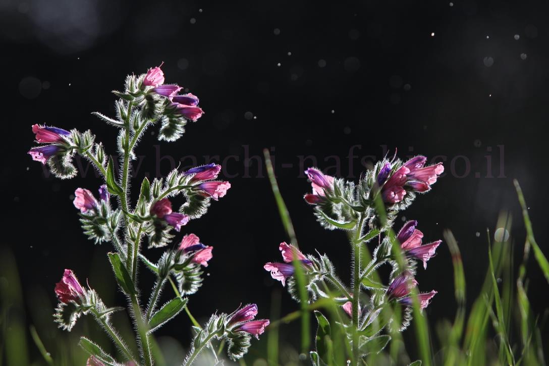 צילום בוקר אמנותי של פרחי העכנאי מוארים באור השמש, כשמעליהם טיפות של גשם מתנוצצות ככוכבי השמים.