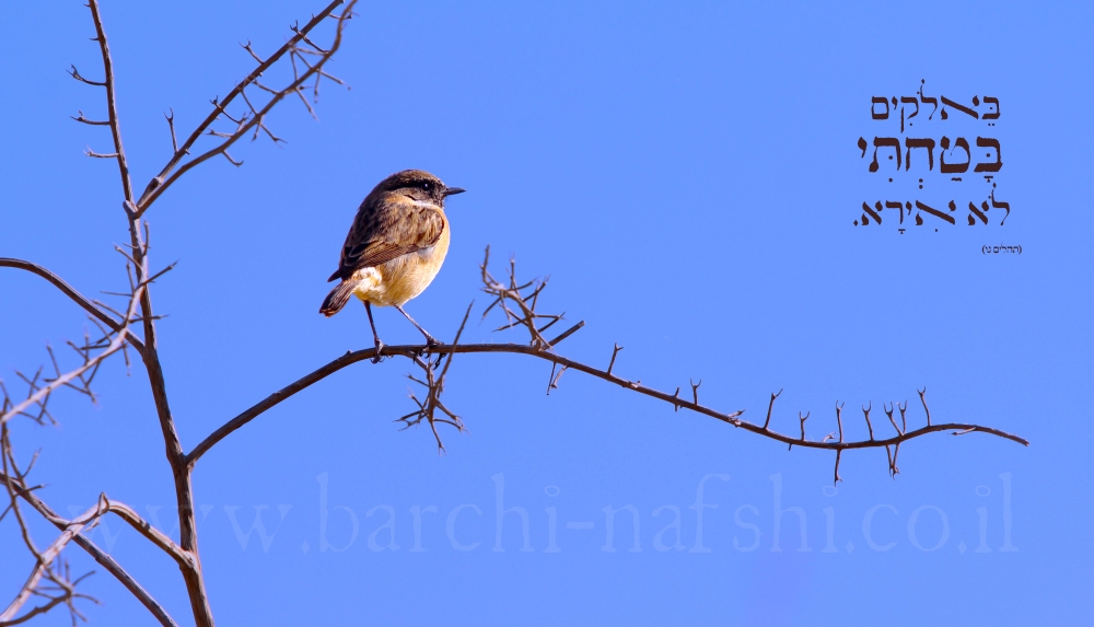 צילום אמנותי של ציפור דוחל שחור גרון, על ענף של צמח החרדל, בשילוב פסוק מתהלים נו "באלוקים בטחתי לא אירא".