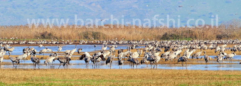 תמונה של להקת עגורים חונים על המים. אזור צילום-עמק החולה. פיתוח על קנבס.