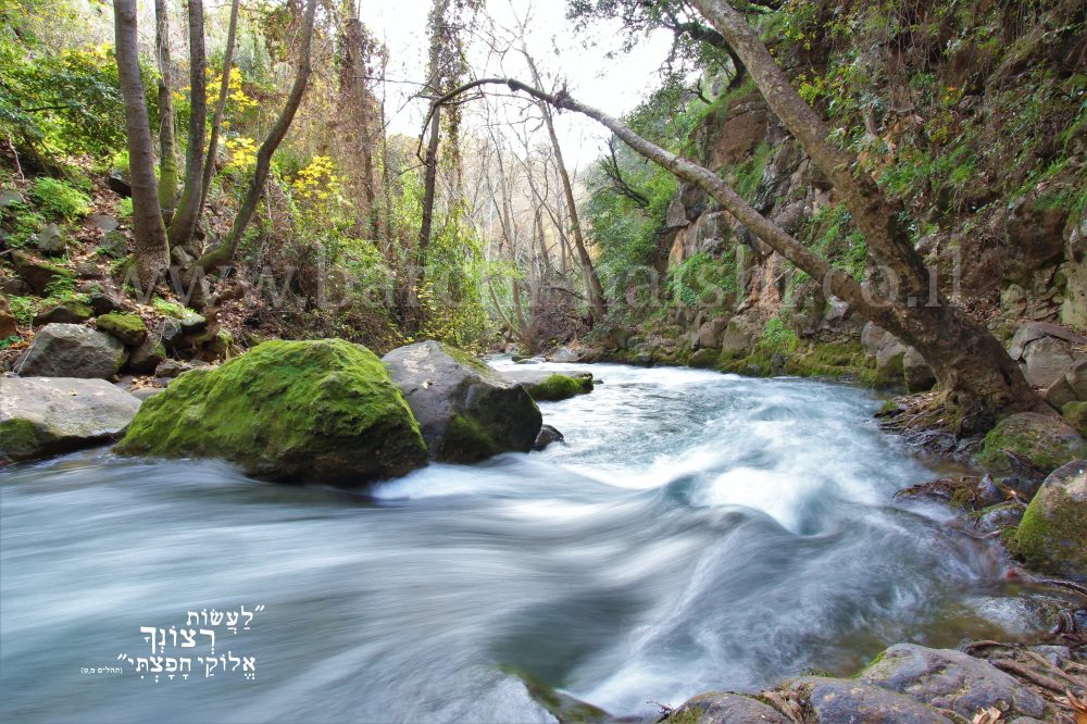 צילום אמנותי של זרימת נחל שוצף בשילוב מילים מתהלים מ,ט "לעשות רצונך אלוקי חפצתי".