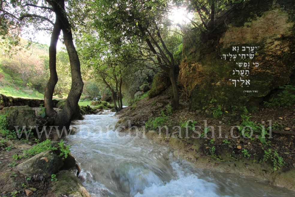 צילום אמנות של זרימת אביב בשילוב מילים משיר הכבוד "יערב נא שיחי עליך".