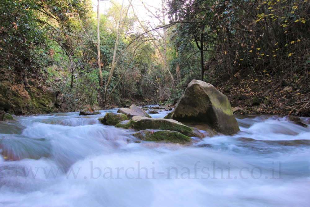 צילום מרגיע ומעורר השראה של זרימת מים בין אבני בזלת בנחל חרמון.