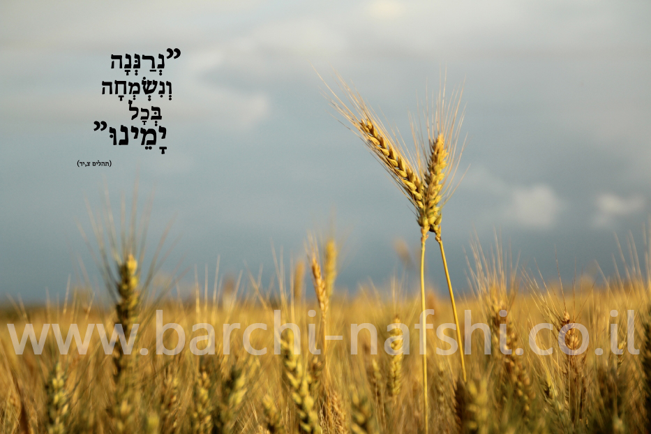תמונה של שיבולים בשילוב פסוק מתהלים פרק צ. "נרננה ונשמחה בכל ימינו".. התמונה מביעה את אפיק חילוף העונות בין חורף לאביב. אזור צילום-שפלה.