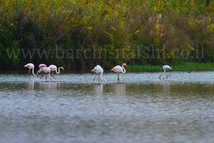 בס"ד צילום נאה של ציפורי פלמינגו נחים באגמון בעת נדידת הסתיו. צולם באגמון החולה. פיתוח כתמונת קנבס.