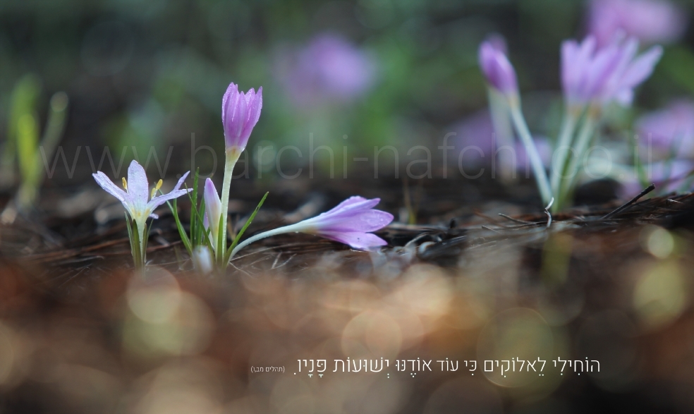 צילום אמנותי מביע תקווה, פרחי סתוונית היורה באור בוקר, בשילוב פסוק מתהלים מב,ו "הוחילי לאלוקים כי עוד אודנו"