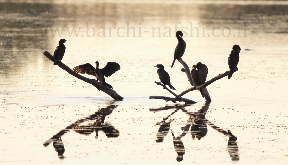 צילום בוקר אומנותי ומרגיע של קורמורנים גמדיים נחים באגם.